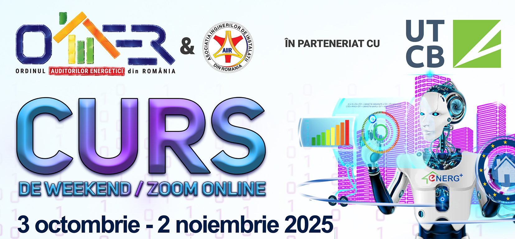 OAER (Ordinul Auditorilor Energetici din România, www.oaer.ro) & AIIR (Asociația Inginerilor de Instalații din România, www.aiiro.ro) în parteneriat cu UTCB (Universitatea Tehnică de Construcții București, www.utcb.ro), organizează în perioada 3 octombrie - 2 noiembrie 2025 un nou curs de pregătire a specialiștilor în vederea atestării la MDLPA ca auditori energetici pentru clădiri (gradul I și II) și de formare continuă pentru auditorii energetici atestați MDLPA. Cursul este recomandat specialiștilor eligibili din toată țara și se va desfășura online, în weekend, pe platforma Zoom. Cursanții vor beneficia de experiența bogată a profesorilor din cadrul UTCB (Universitatea Tehnică de Construcții București, www.utcb.ro) și UAUIM (Universitatea de Arhitectură și Urbanism „Ion Mincu”, www.uauim.ro)