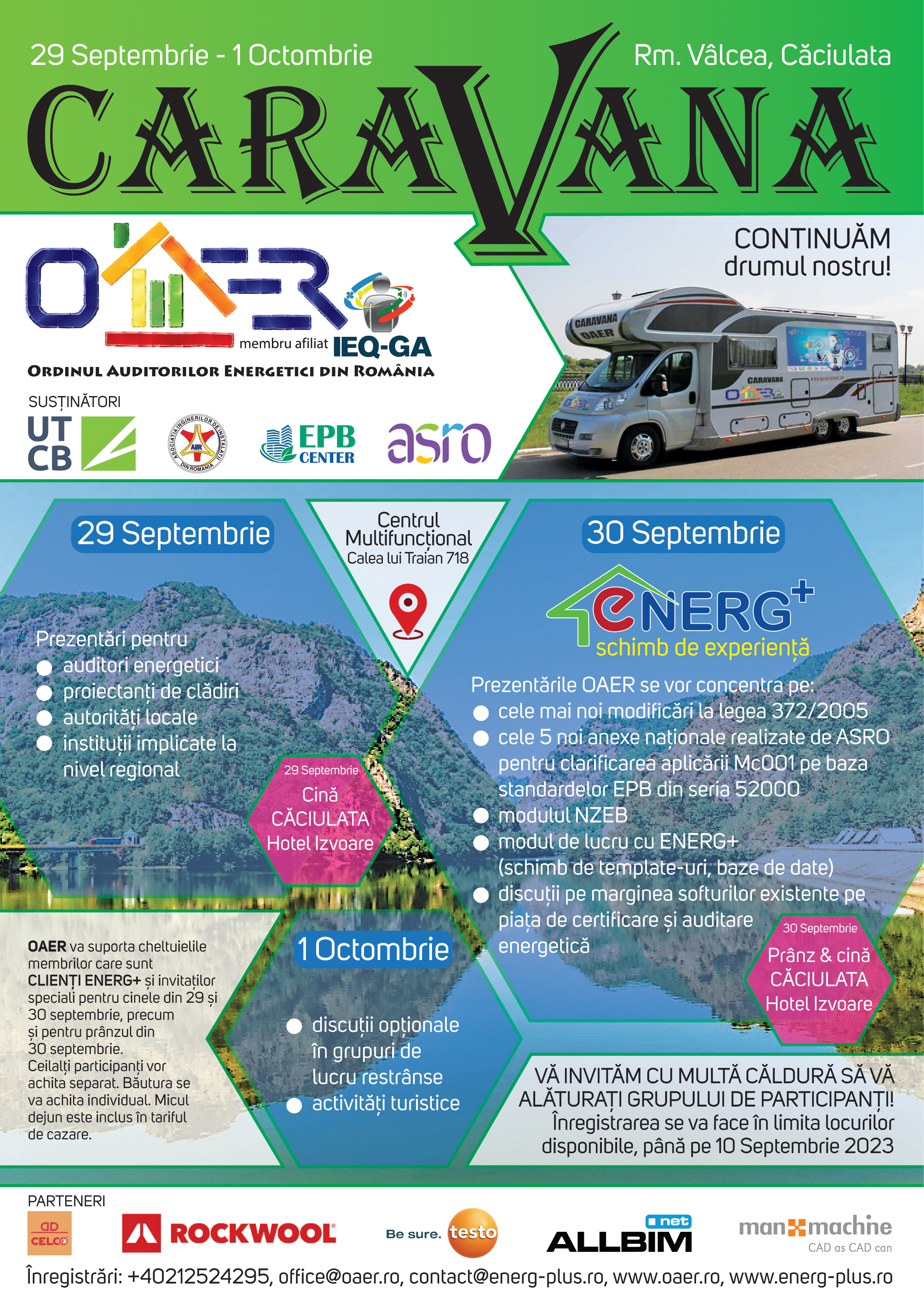 De această dată Caravana OAER de la Râmnicu Vâlcea va continua și a doua zi, 30 Septembrie 2023, cu un eveniment dedicat clienților ENERG+. Invităm lângă noi și potențiali clienți (auditori energetici, arhitecți, ingineri proiectanți și evaluatori “Green Buildings”, care sunt interesați să facă parte din comunitatea ENERG+.