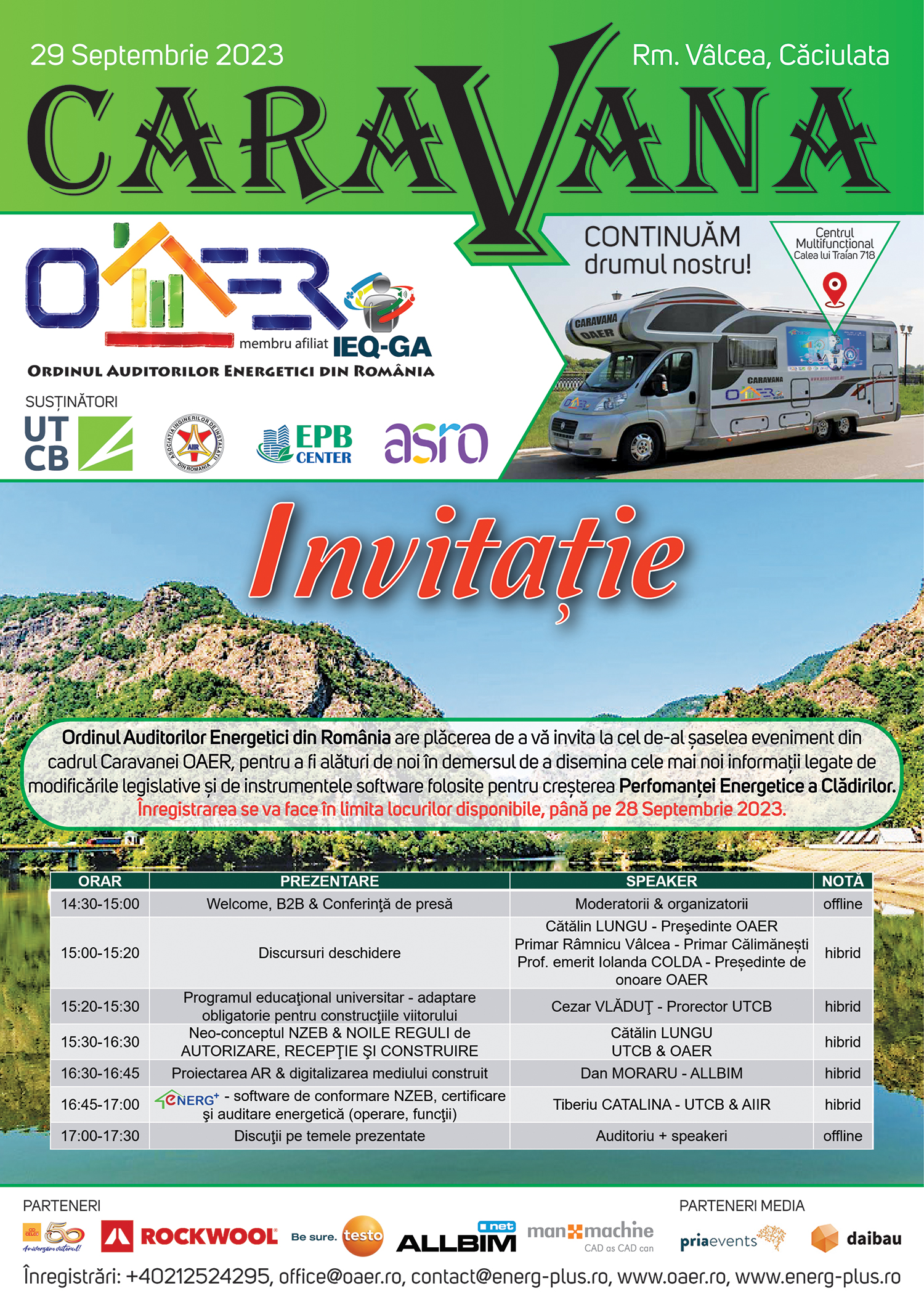 Pe 29 septembrie reprezentanții OAER împreună cu cei ai UTCB se vor deplasa cu CARAVANA la Râmnicu Vâlcea, Stațiunea Căciulata, Centrul de Informare Turistică, iar ulterior vor mai opri, după ce au fost deja la Pitești, Constanța, Sibiu, Bacău și Craiova, și în stațiile Oradea, Galați, Arad, Suceava, Baia-Mare, Târgu-Mureș, Ploiești, Petroșani, Brașov și, în final, București. Obiectivul principal este acela de a transmite cât mai multe informații despre noile concepte pe care autoritățile locale, dezvoltatorii dar și constructorii vor fi obligați prin legi și norme tehnice să le aplice tuturor categoriilor de clădiri: minimizarea consumurilor de energie și a emisiilor de CO2, utilizarea adecvată din punct de vedere tehnic dar și economic a surselor regenerabile de energie, proiectarea BIM (Building Information Modelling) și AR (Augmented Reality), tratarea aerului respirat de ocupanți în spațiile din interiorul clădirilor cu echipamente adecvate pentru ventilare mecanică și dezinfectare, exemplificarea unui soft complex pentru proiectarea energetică a clădirilor viitorului sau pentru renovarea aprofundată a clădirilor existente. De asemenea, cadre universitare ale UTCB împreună cu specialiști reputați la nivel regional ai OAER își propun să explice importanța legislației europene în domeniul performanței energetice a clădirilor, a noilor programe europene cum ar fi GREEN NEW DEAL sau FIT FOR 55, precum și implicațiile pentru sectorul construcțiilor din Romania, în contextul finanțărilor asigurate prin PNRR (Planul Național de Redresare și Reziliență) sau prin celelalte programe pentru fonduri structurale de dezvoltare.