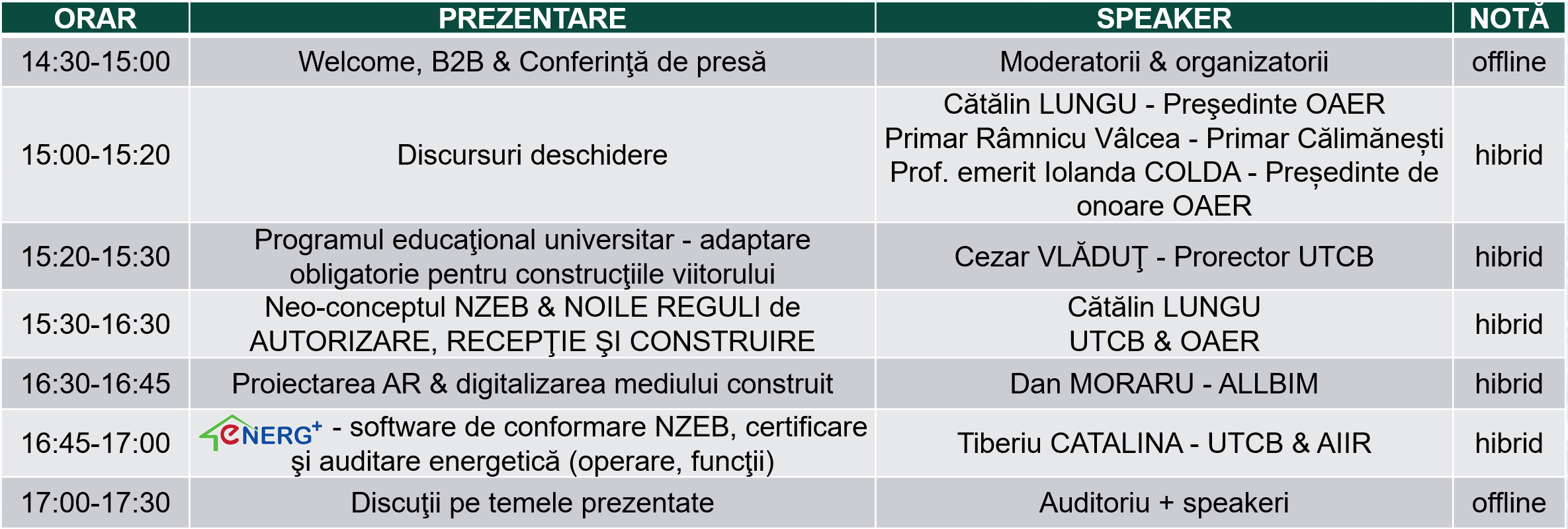 OAER (Ordinul Auditorilor Energetici din Romania, www.oaer.ro) împreună cu UTCB (Universitatea de Construcții din București, http://utcb.ro ) și partenerii lor, organizează pe 29 septembrie la Râmnicu Vâlcea, Stațiunea Căciulata al 6-lea webo-seminar din cadrul Caravanei ”OAER & UTCB”, cu tematica „Clădirile viitorului: neo-conceptele NZEB & ZEB, proiectarea AR și digitalizarea mediului construit”. Specialiști ai UTCB și OAER vor explica arhitecților, auditorilor energetici, inginerilor cu activitate în domeniul construcțiilor, dezvoltatorilor, autorităților publice locale și tuturor celor interesați ce înseamnă conceptul inovator NZEB (clădiri cu consum de energie aproape egal cu zero) și cum va evolua sectorul clădirilor noi și existente în contextul noilor programe de finanțare prin fonduri structurale și PNRR.